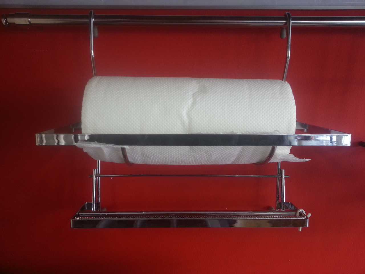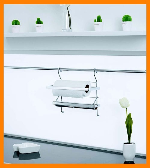 Хромирана поставка за домакинска хартия и стреч за закачване на кухненска тръба. За монтирането на аксесоара не са необходими допълнителни държачи или елементи.