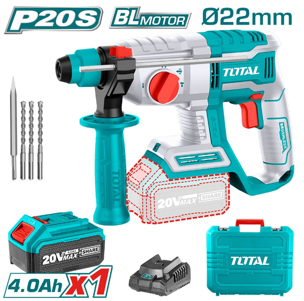 Акумулаторен перфоратор TOTAL от серия Industrial, снабден с безчетков мотор, гарантиращ надеждност и безпроблемна работа.
