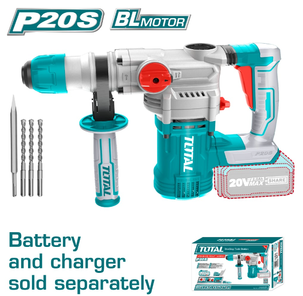 Мощен акумулаторен перфоратор TOTAL от серия Industrial, снабден с безчетков мотор, гарантиращ надеждност и безпроблемна работа.