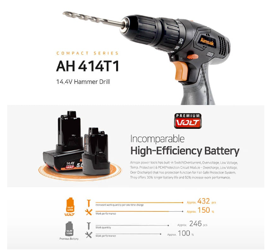 Висококачествен инструмент с компактна 14.4 V батерия, гарантиращ удобство и комфорт по време на работа. Високоефективната батерия с SAMSUNG клетки гарантира дълъг експлоатационен живот, благодарение на защитата от претоварване, прегряване и пренапрежение.