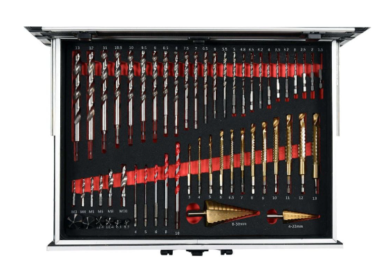 • 12 бр свредло-фрезер TiN HSS: 3; 4; 5; 6; 6,5; 7; 8; 9; 10; 11; 12; 13 мм