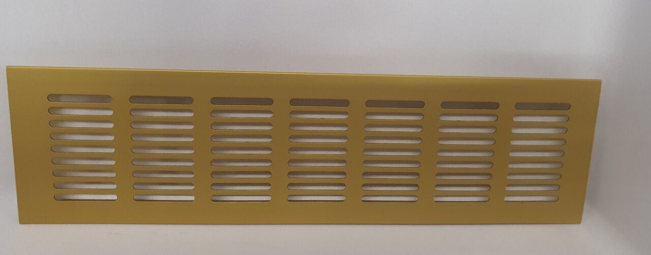 Алуминиева решетка в цвят злато от Джесур Груп – стилно решение за вентилация на шкафове и врати. Осигурява ефективен въздухообмен, предотвратява влага и миризми, и е лесна за монтаж. Идеален избор за елегантен и функционален интериор