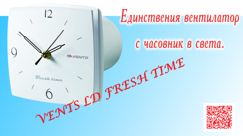 "Vents серия LD Fresh Time" е вентилатор за извеждаща вентилация, с капацитет до 167 m3/h. Предназначен за периодична или постоянна вентилация, на санитарни и/или комунални помещения (бани, кухни и др). Модерен дизайн и естетическия вид, специалният дизайн на перката превръща "Vents серия LD Fresh Time" в високо ефективен и надежден вентилатор. Вентилаторът е с вграден часовник на батерии*. Контролът на вентилатора се осъществява, ръчно от ключа за осветление, или автоматично c BU-1-60 (виж Системи за контрол на вентилатори).