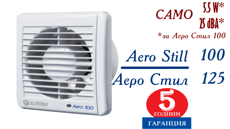 Безшумен битов вентилатор Blauberg Aero Still 100 с двигател на лагери, капацитет 84 m3/h и ниво на шум само 25 dBA.