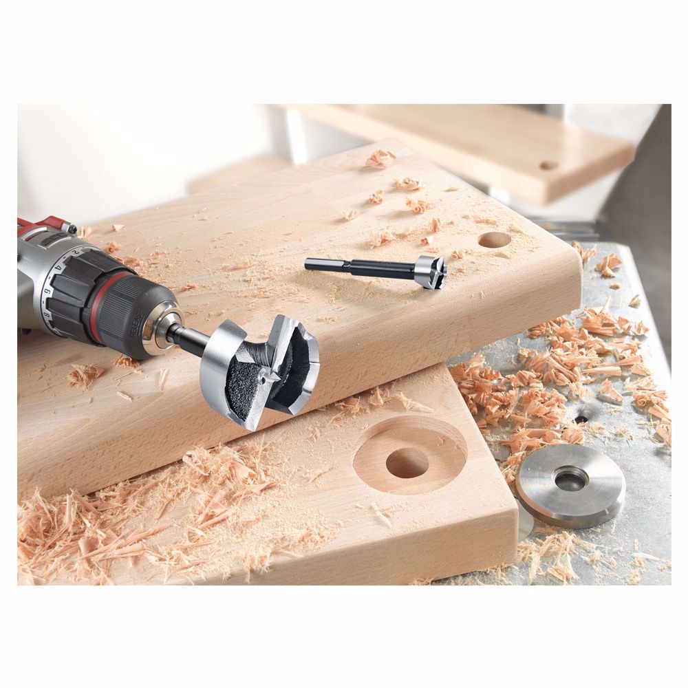 Челно-цилиндричен фрезер за дърво, изработен от качествена инструментална стомана, с центриращ накрайник за точково пробиване и периферни режещи ръбове за безпроблемно и прецизно пробити отвори.
