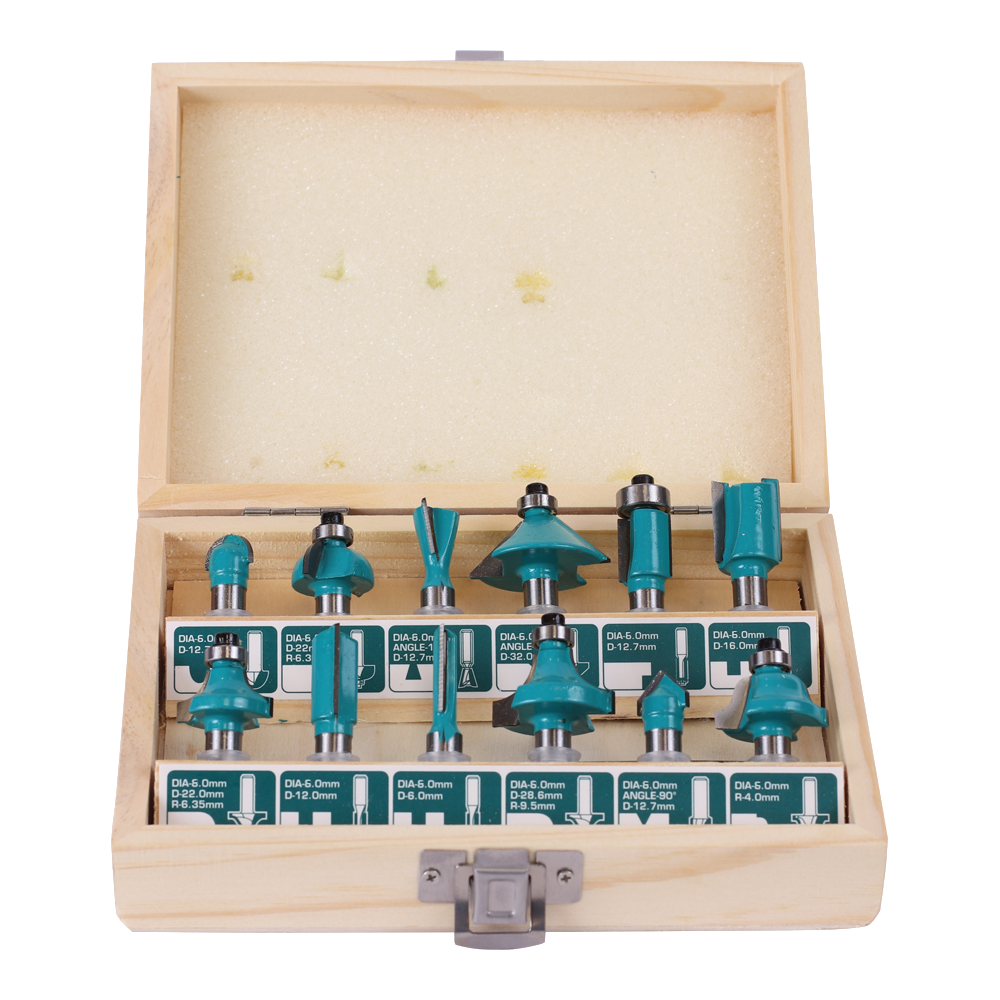Комплект от 12 броя прецизно изработени високоскоростни фрези за дърво, събрани в практична дървена кутия за лесна проверка и бърз избор на правилния инструмент.