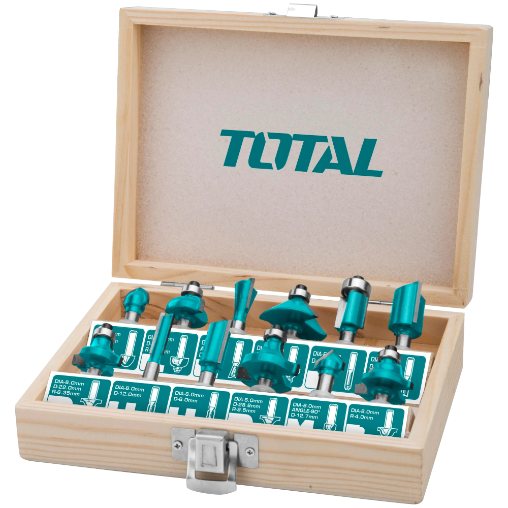 Комплект фрези за оберфреза TOTAL, опашка 6 мм, 12 части спомага за създаване на уникални мебели.