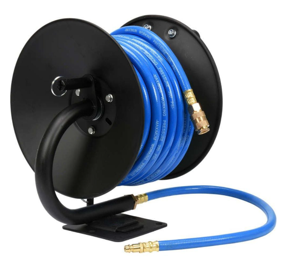 Пневматичен маркуч на макара със стандартни бързи връзки. Възможност за монтаж на стената или на пода.