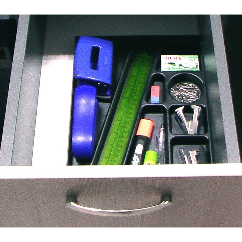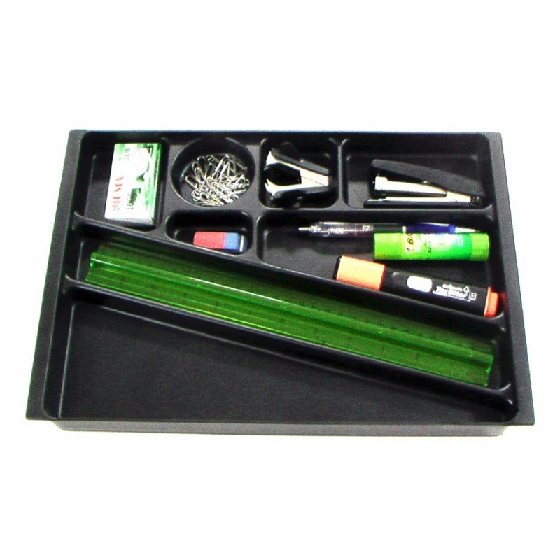 Органайзер, който ще внесе ред в чекмеджето и осигури достатъчно място за необходимите офис аксесоари. С универсален дизайн за удобна организация на офис аксесоарите на бюрото. С неговите 8 бр. разпределения с различна форма и размер ще могат да се съберат всички разпръснати по бюрото неща като ключове, химикали, листчета и др.