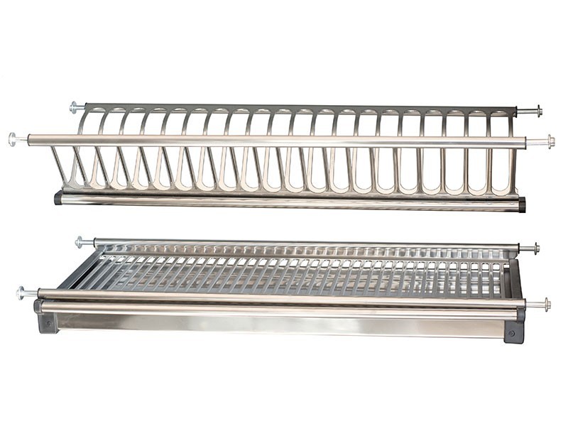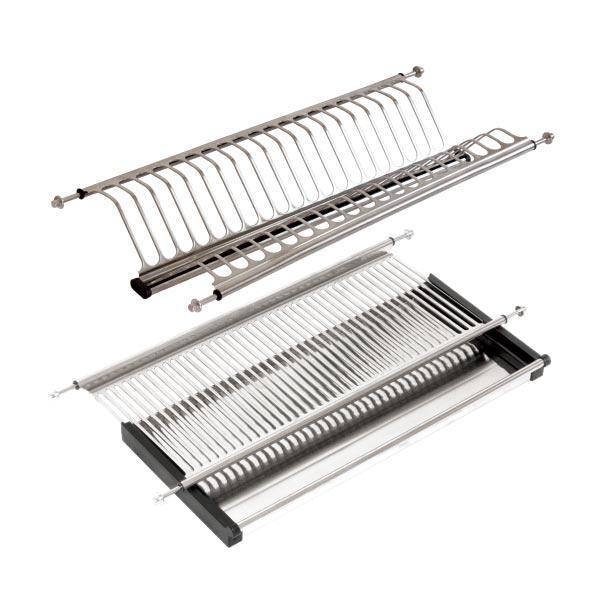 Висококачествен отцедник и сушилник за съдове за вграждане в кухненски шкаф на 2 нива, модел INOX – съвременно решение за организация на кухненския интериор. Изработен от устойчив INOX материал (неръждаема стомана), този сушилник предлага стил, издръжливост и устойчивост на корозия. Интелигентният дизайн на две нива осигурява ефективно използване на пространството: горното ниво е предназначено за чинии, докато долното предлага място за чаши и други кухненски аксесоари. Допълнителна тава за отцеждане предпазва шкафа от влага и улеснява почистването. Идеален избор за модерни кухни, които съчетават функционалност и елегантност.