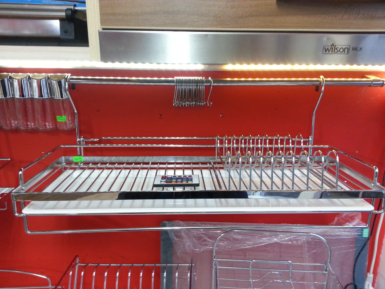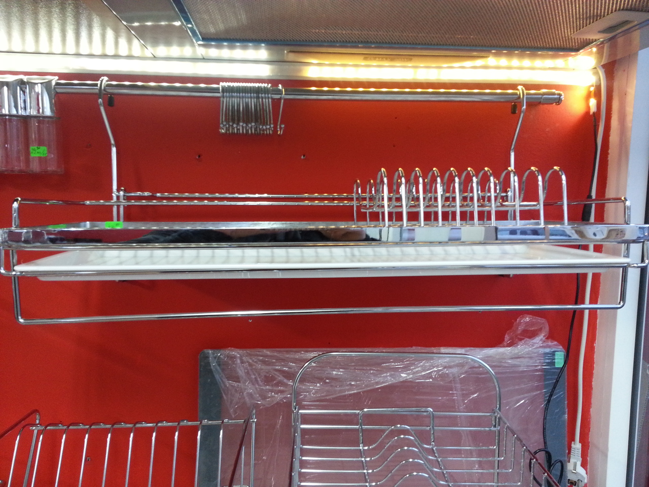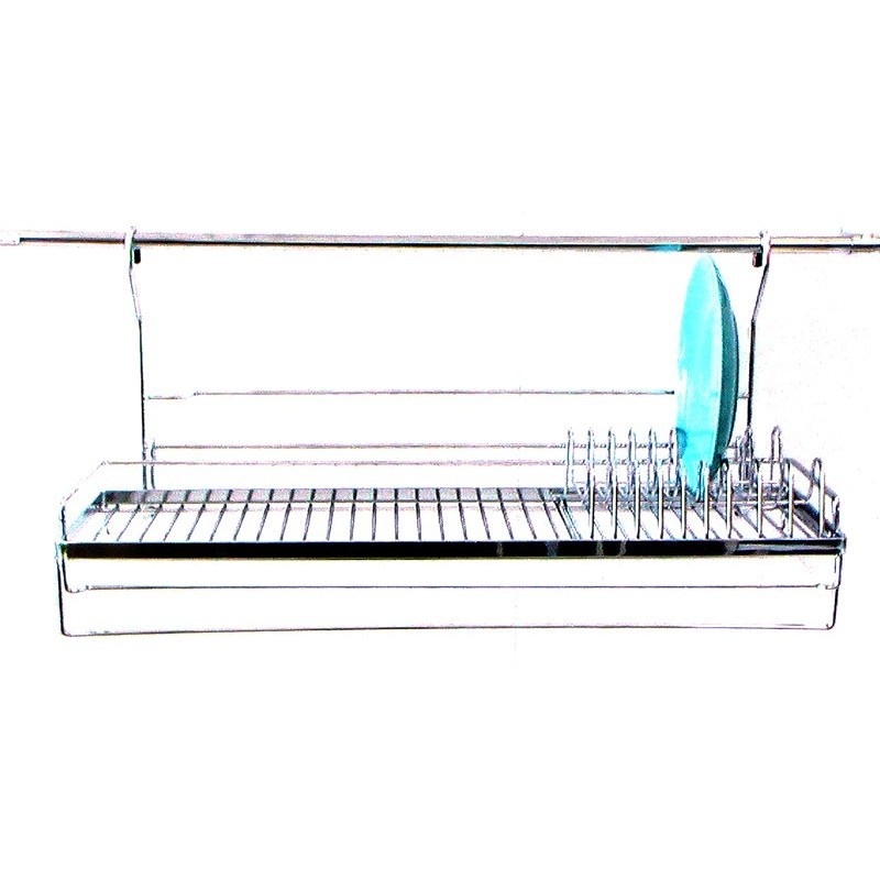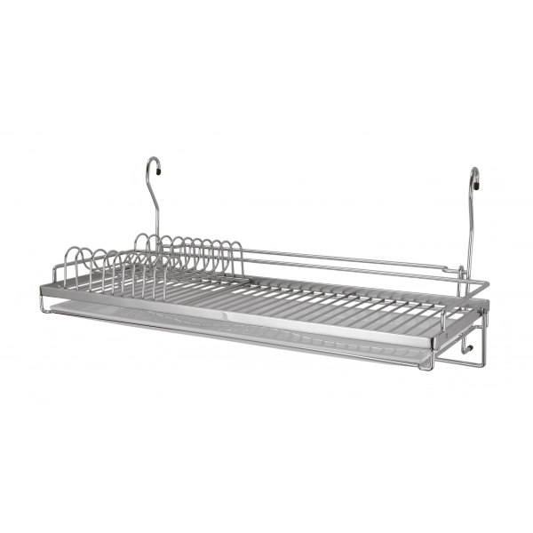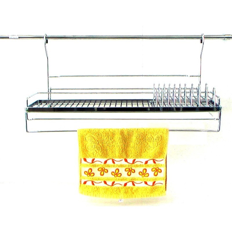 Висящ отцедник за чинии с пластмасова тавичка. Този отцедник е практичен, защото се закачва на кухненска тръба и не заема от пространството на плота. Подходящ за мокри чинии. Завършва с пръчка за кърпа. За монтирането на аксесоара не са необходими допълнителни държачи или елементи.