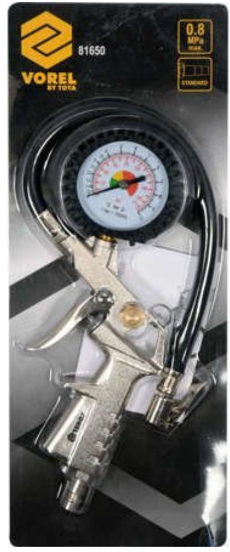 Многофункционален пистолет с манометър. Практичен както в домашната поддръжка, така и в сервизите или автосервизите. Използването на адаптери, (не са включени в комплекта), позволява напомпване на надуваеми лодки, дюшеци, топки и други.
