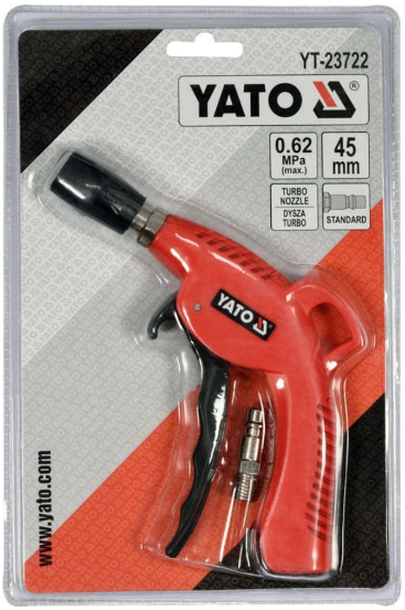 Пистолет за издухване на сгъстен въздух с турбо дюза за повишаване силата на въздушната струя. Идеален е за отстраняване на мръсотия, прах и кал от машини, устройства и двигатели, както и за охлаждане и изсушаване на различни видове повърхности.