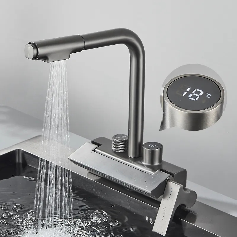 Изживейте революция в дизайна на вашата кухня с нашите премиум смесители с водопад, завършени в стилния и съвременен цвят титан. Тези майсторски изработени аксесоари са създадени да трансформират вашето ежедневие, предлагайки несравнима естетика и функционалност, докато добавят блясък и модерно усещане към всяко кухненско пространство.
